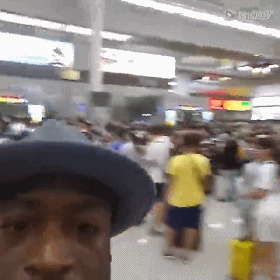 面对人山人海的机场韦大爷兴致盎然玩起自拍