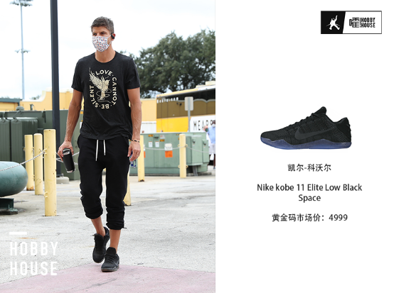 雄鹿球员科沃尔在赛前上身一件黑色T恤,胸前一只巨大的金鸟张开翅膀,仿佛要挣脱束缚。而在鸟的身边,由“爱不能沉默”组成的字母印花环绕四周,像一个笼子般困住它的自由。下身搭配黑色束脚长裤,白色的束带不羁的显露在腰前,现在这样的穿法已经成为一种潮流,增加时尚元素。上脚这双低帮 kobe 11 Elite 以全黑鞋面为主,配以蓝色水晶底收尾,鞋款采用飞织技术坚固耐用,同时兼备轻便性,脚感舒适。作为一双实战鞋,这双鞋可以兼具五个位置,就是价格有点吓人。