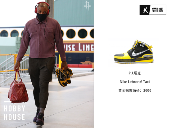 手上提着的这双 Nike Lebron 6 Taxi 很有年头,这双球鞋的造型灵感来自于纽约街头的出租车,诞生于2009年。整双鞋以黑色为底,搭配上亮皮材质的黄色做为点缀,此外于脚踝处也有个黑灰格纹的特点。除了出租车的黑色和黄色外,鞋款还有一个银色的“钩形”和灰色外底。据悉这双鞋当时仅在纽约各特定店铺内极少量发售,看得出塔克真的是各个角落的宝贝都不愿放过啊!