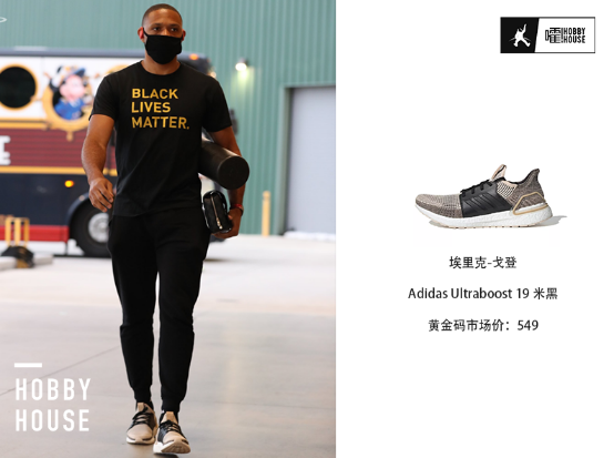 戈登今天表现也很差劲,6次三分出手只命中1次,投篮命中率12中3。赛前戈登一身黑色装扮,上衣使用黄色字体表达“黑命贵”诉求,鲜亮的黄色给整身穿搭提高色彩鲜亮度,不至于太过沉闷。黑色束脚裤跟脚上的那双Adidas Ultraboost 19 米黑正搭配。这双顶级的跑鞋上脚后非常舒适,针织鞋面更加轻薄,半透明形式出现,走在路上仿佛会呼吸,十分清爽。