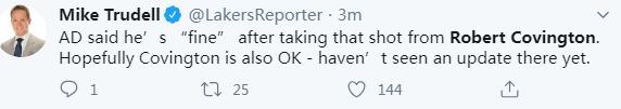 安东尼-戴维斯在赛后的采访中也表示,我感觉到他撞到了我的手肘与肋骨,他的面积应该受伤了,希望他能健康。