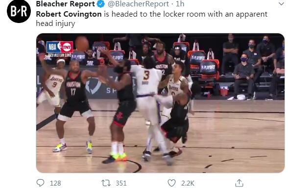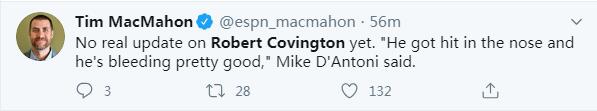 根据赛后德安东尼的采访,他表示科温顿鼻子被撞了流了很多血。