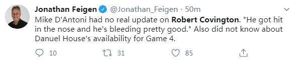 最后乔纳森-费根曝出一个消息,科温顿在赛后仍在流血,而根据德安东尼的说法他也不知道丹纽尔-豪斯在G4中能否出战,也就是说下一场比赛这支球队的轮换有可能进一步削减。