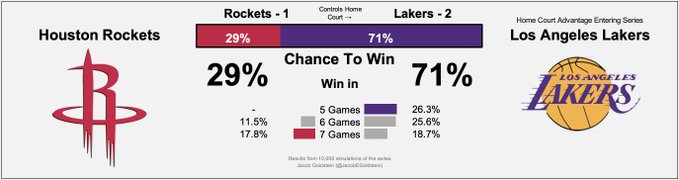根据数据专家雅各布-戈尔茨坦的分析,湖人晋级西决的概率已经提升到71%,而马赛克只要29%,湖人4-1击败马赛克晋级的概率都达到26.3%。马赛克危矣。
