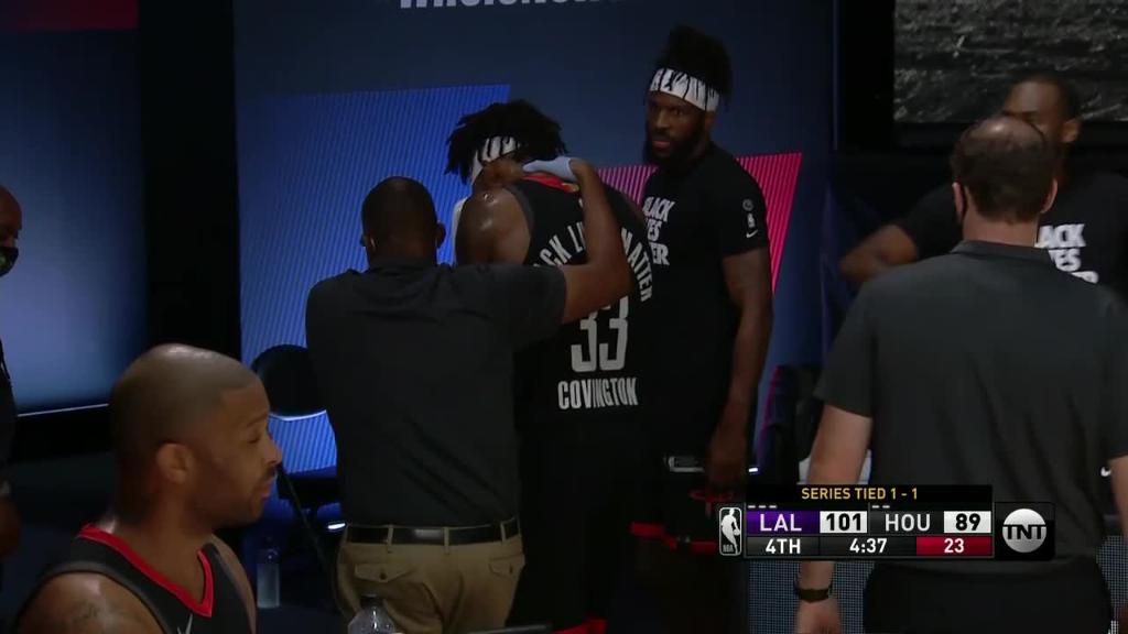 但是在这场比赛中马赛克十分不幸,在末节还剩4分37秒,科温顿与安东尼-戴维斯相撞,科温顿撞到AD的肋骨,他在撞到AD肋骨的同时面部还与AD的手肘有接触,这次撞击后科温顿流血不止。