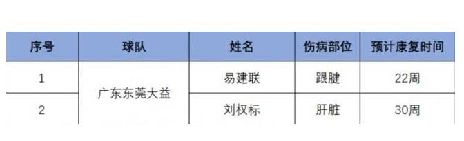 在广东男篮的伤病名单中,男篮一哥易建联依旧需要22周的康复期,而刘权标竟然也进入了伤病名单,名单中刘权标的伤病是肝脏,可让人无法接受的是预期康复时间竟然高达30周,这也意味着刘权标大概率会缺席本赛季的比赛。