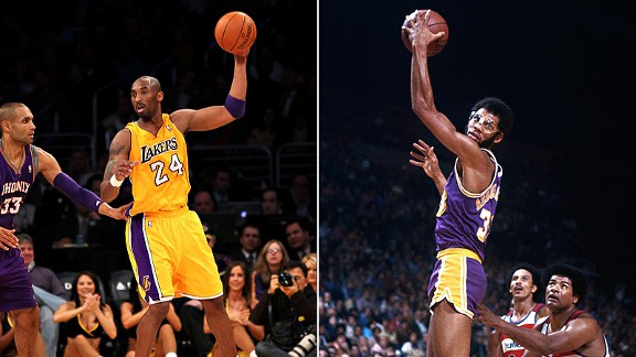 贾巴尔曾2次当选得分王,生涯单场得到24.6分;科比同样2次当选得分王,生涯场均可得25分。但贾巴尔总得分更高达38387分,位居NBA历史首位,科比则以33643分位列第4。