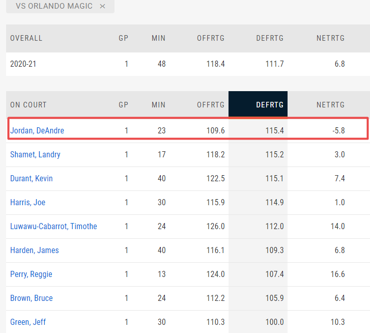 高阶数据显示,本场比赛当小乔丹在场的23分钟内,篮网防守效率仅有115.4,全队最差,净效率-5.8同样是全队最差。而当他不在场的25分钟里,篮网防守效率提升到了103.8,差距还是显而易见的。