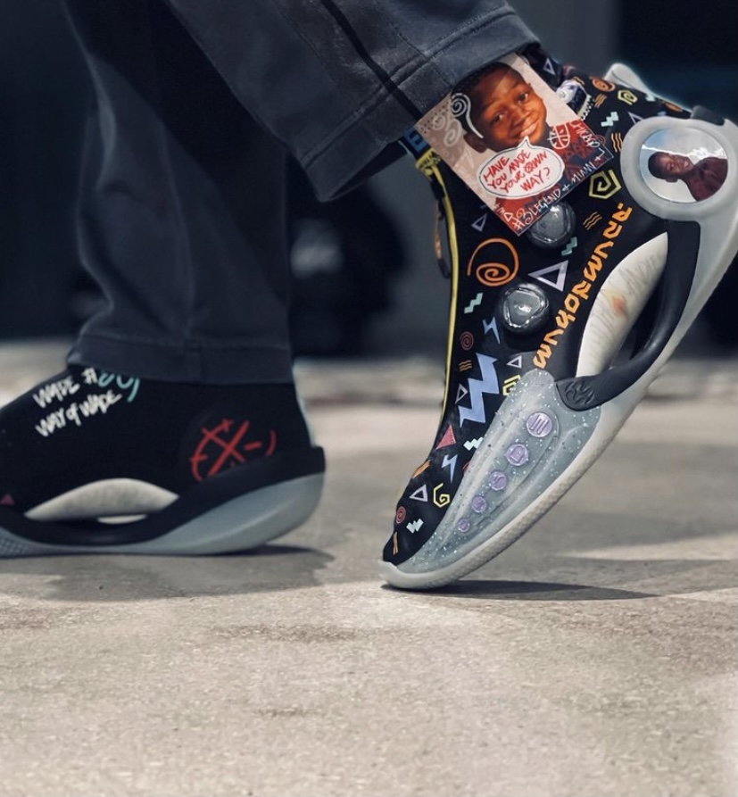 本次的韦德之道9 Infinity生日特别版本,鞋身以黑色为基调,将丰富的图形Logo覆盖于鞋面,颇具玩味,鞋身内侧亦有韦德之前的“3”号球衣号码以及“WAY OF WADE 9”等字样。同时,该鞋还运用拼贴的手法将韦德本人儿时的大头照呈现在鞋后跟位置,极具收藏价值,该鞋或是韦德本人今年收到的最有纪念意义的生日大礼了。