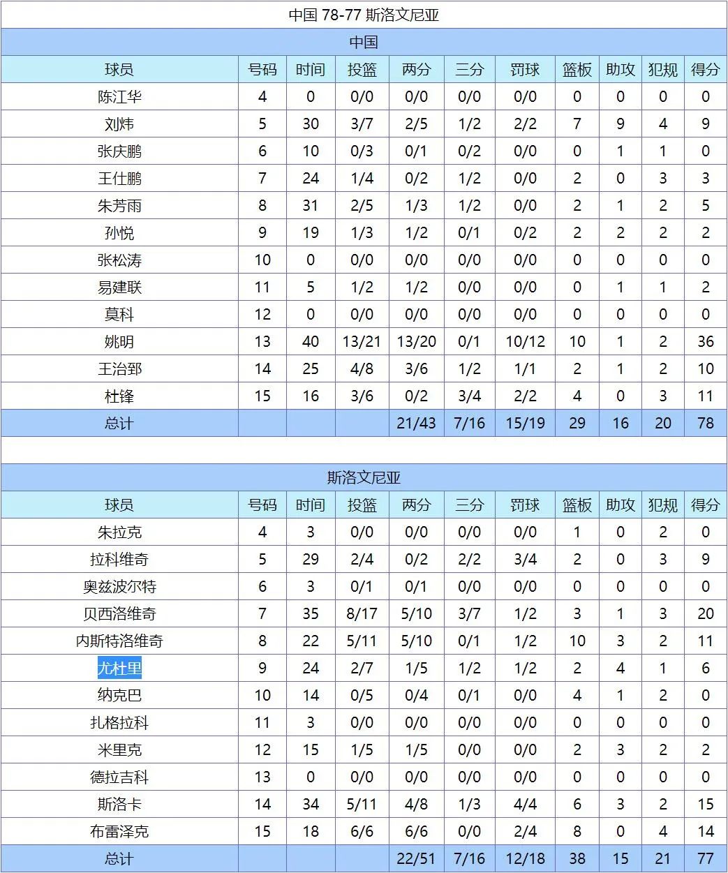 最终中国队78比77险胜对手,成功打进16强!那场比赛的数据统计教主也找到了,尤杜里7投2中仅得6分4助攻。除了这场比赛之外,那届世锦赛尤杜里表现不错,他场均11.2分2.3篮板2.4助攻。