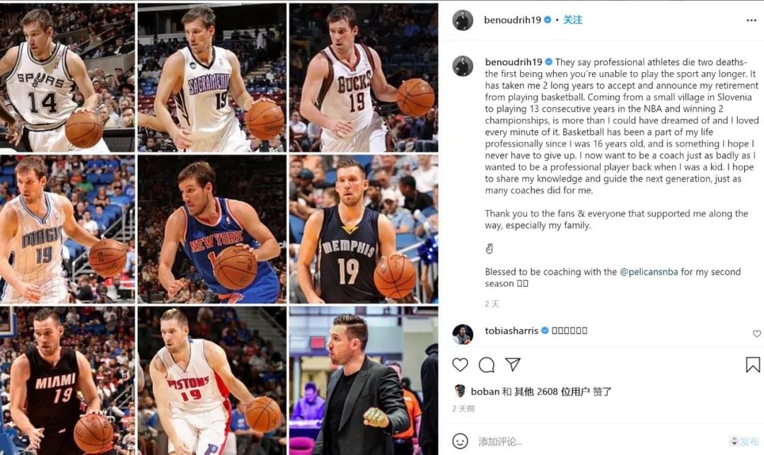 尤杜里还表示,每个球员都会死去两次,第一次就是你告别这项运动的时候。包括托拜亚斯-哈里斯、大白边和博班在内的NBA球星,都在评论区向这个老将表达敬意。球员生涯虽然结束,但尤杜里不会远离篮球,他在鹈鹕担任球员发展教练。