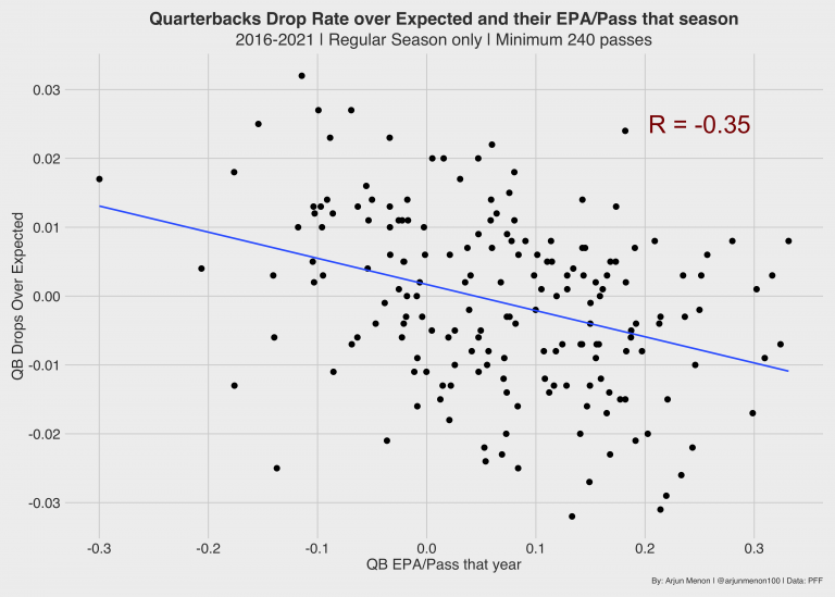对于四分卫来说,最后要调查的是这一点是否重要。我们可以查看超出预期的脱手是否与当季的传球EPA有关。