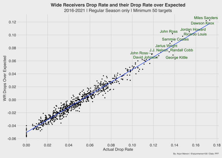 为了检验这一点,我们首先需要建立重要的变量。然后,我们可以在既定的进攻中加入档数和空中飞行码数。然后我们将其放入逻辑回归模型中,以预测脱手的可能性。在得出四分卫和接球手的“脱手率超过预期值(DROE)”之后,我们可以看看哪一组对脱手更该负责任,以及本赛季这两个方面谁最强、谁最烂。