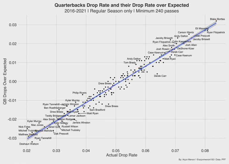 自2016年以来,共有184名四分卫传球尝试次数超过240次。2018年,没有任何人的DROE比布雷克-博特尔斯更高。他的接球手脱手率为8.4%,比预期脱手率高出3.2%。2016年以来脱手率低于预期最多的四分卫是德肖恩-沃森,他只经历了11次脱手,脱手率低于预期3.2%。