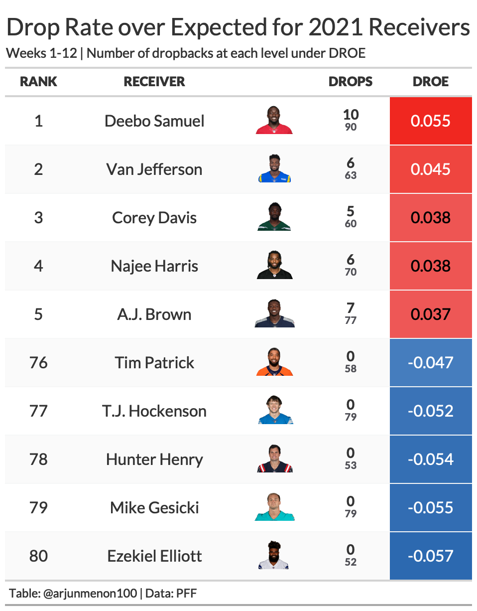 本季至今,49人外接手迪博-塞缪尔的DROE是联盟最高的。尽管他今年的产量极其惊人,尤其是在后场运作时,但他在90次被传球中出现了10次脱手。而脱手率表现最好的都是些近端锋,这很容易理解,因为近端锋在中路接到的都是些四分卫的安全球。