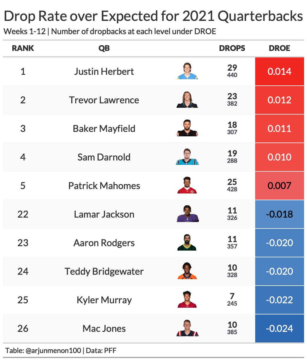 以闪电四分卫贾斯汀-赫伯特为例。他的接球组(包括近端锋和跑卫)本季前12周一共出现29次脱手冠绝联盟。赫伯特拥有炮弹手臂作为武器。就像我们在PFF数据中惊讶地发现冲传施压是一项与四分卫密切相关的数据一样,赫伯特这样的情况让人好奇:脱手是一项四分卫数据还是一项接球手数据?像赫伯特这样的加农炮手臂比其他人出现更多的脱手,这是他们的错误吗?