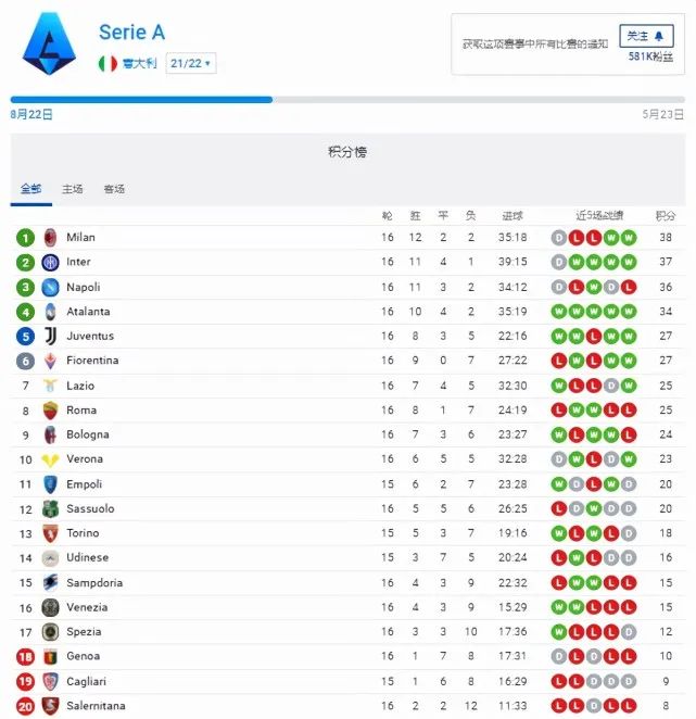 排名第2的同样是过去几年成绩平平的都灵,他们仅有39分。原本被认为实力最强的尤文图斯居然只是名列第6,顶级豪门国米和AC米兰分别位居第3和第5.