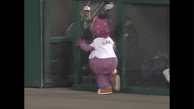 不过它最为知名的事件发生在1995年。当时在美联冠军赛上,它在为球队加油时过于投入,从6英尺(1.83米)的外场墙摔了下来;尽管高度不是太高,它的膝盖韧带还是因此撕裂,成为了吉祥物“受伤”的名场面。