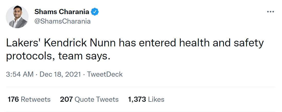 2021-12-18 04:25北京时间12月18日,据名记查拉尼亚报道,湖人队后卫纳恩触发健康安全协议。纳恩目前还在养伤,本赛季还没上过场,他成为了湖人第六位触发协议的球员,此前,队内的霍顿-塔克、霍华德、蒙克(已回归)、威少、布拉德利都曾触发协议。