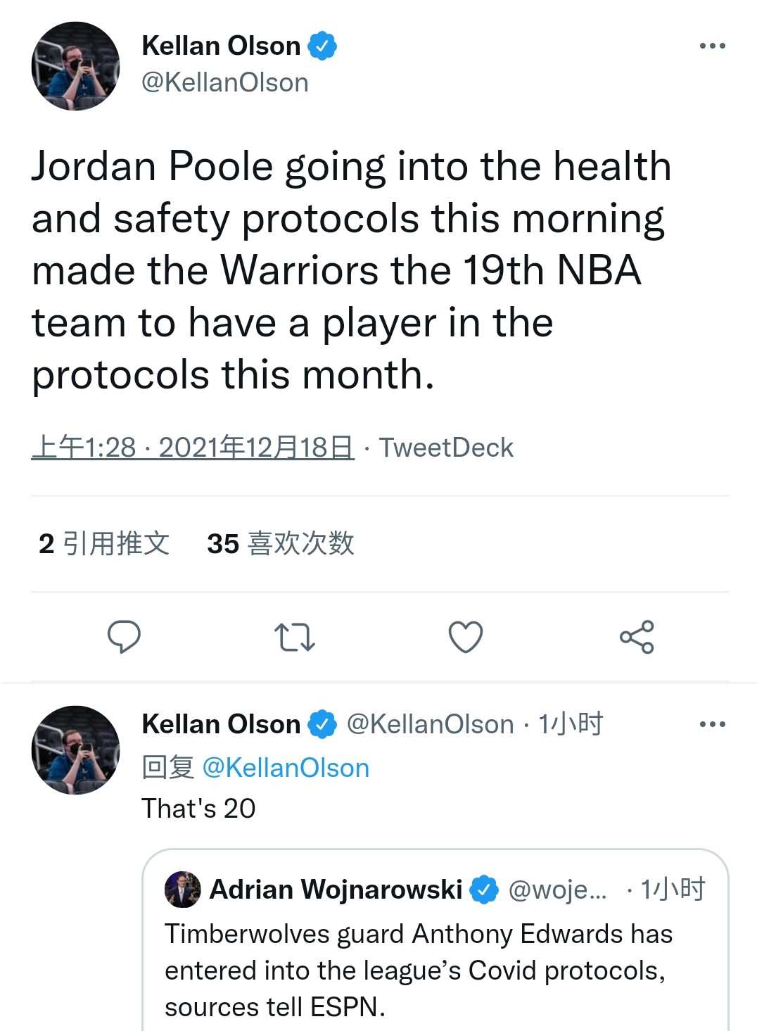 勇士的普尔中招时,NBA记者Kellan Olson报道称本月已有19支球队有球员触发协议,随着森林狼的爱德华兹被隔离,Olson将这一数字更新至20。