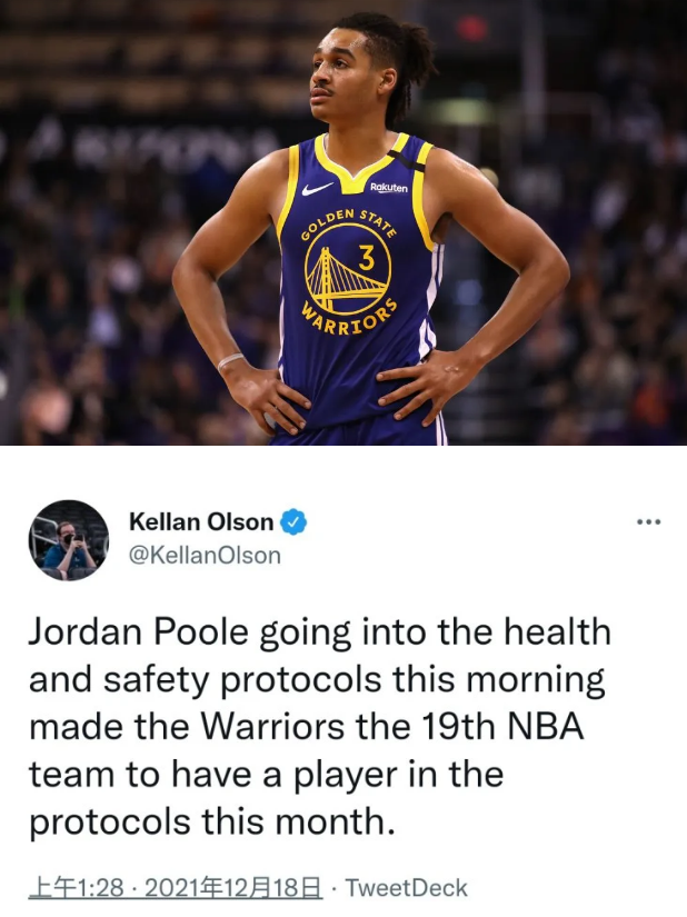 在普尔被隔离之后,NBA目前已经有超过20支球队中招,而勇士队的零感染纪录也被打破。