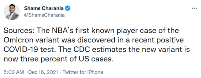 在近日确诊的病例中,NBA已经出现了首例奥密克戎毒株!这一新变种,在美国病例中占到3%。