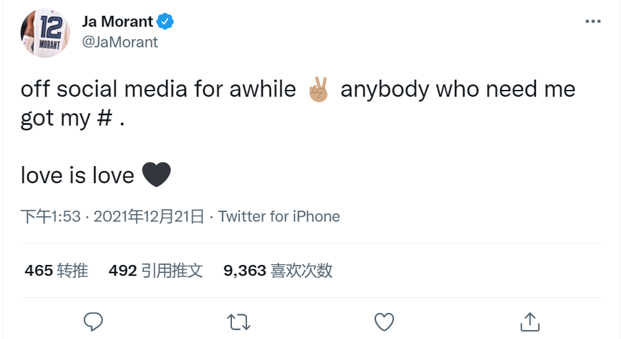 伤心之余,莫兰特也更新社媒宣布,他会暂时关闭一段时间的社媒,“谁有事请给我打电话。爱就是爱。”