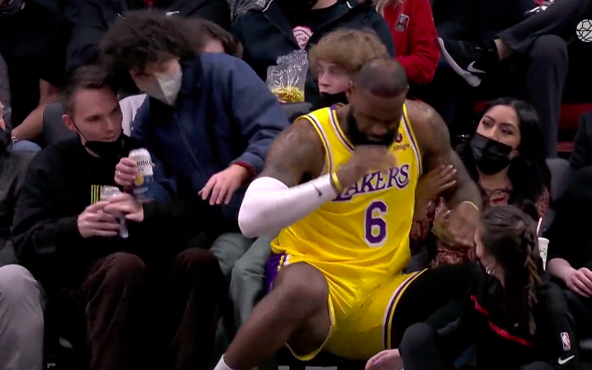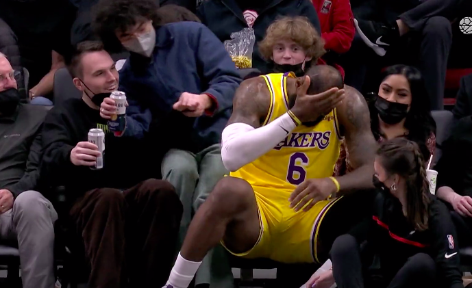 争议!詹皇上篮被打头部,一度晕眩坐场边板凳席:女球迷赶紧扶他