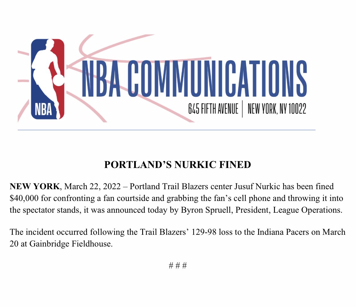 开拓者队中锋努尔基奇因为在3月21日开拓者队客场挑战步行者队的比赛中,他在场边与球迷对峙并抢夺球迷手机扔到观众席上,他将被罚款40000美元。值得一提的是,据名记Chris Haynes报道,这名球迷当时大声辱骂努尔基奇的妈妈与祖母,这才是后者发怒的原因。