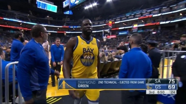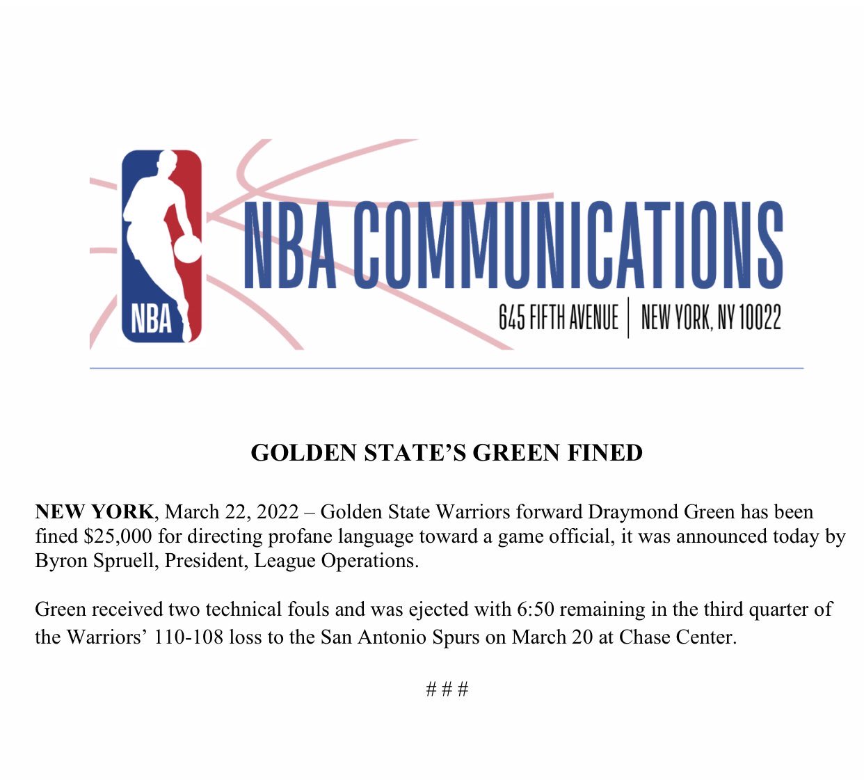勇士队球星格林因为在勇士对阵马刺的比赛中被向裁判发表亵渎语言被罚款25000美元。这起事件发生在该场比赛第三节,在一个防守回合中,格林被吹罚阻挡犯规,他对此十分不满。于是他连续怒喷裁判,最终被连续吹罚两个技术犯规遭到驱逐出场,勇士队最终也以108:110负于马刺队。
