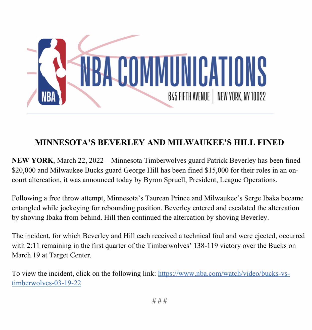 另外,森林狼球员贝弗利与雄鹿球员乔治-希尔因为比赛中发生冲突遭到处罚,贝弗利被罚款20000美元,乔治-希尔被罚款15000美元。在这场比赛中,雄鹿球员伊巴卡与森林狼球员普林斯在卡位时发生争执,贝弗利上前直接怒推伊巴卡一把,随后希尔给与回击去,双方险些爆发冲突,裁判迅速将所有人分开。贝弗利与希尔被驱逐出场,伊巴卡被吹技术犯规。