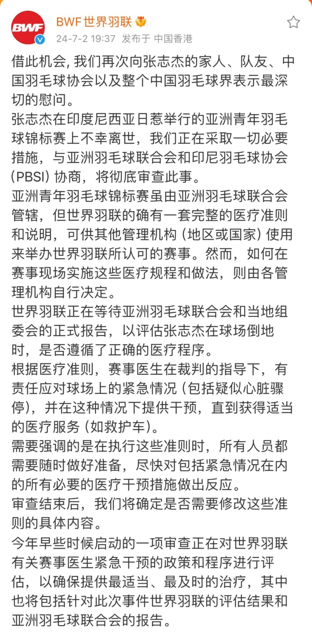 此外,世界羽联还透露,他们今年早些时候已经启动了一项针对赛事医生紧急干预政策和程序的审查工作。此次张志杰的离世事件将作为该审查工作的重要参考,以进一步完善和提升羽毛球赛事的医疗保障水平。
