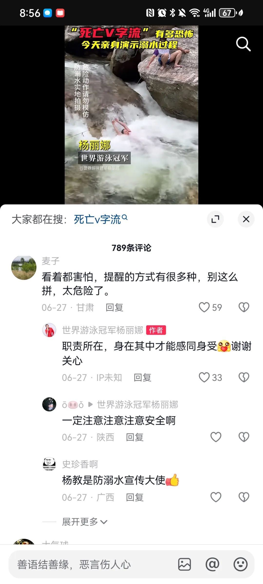 拍摄前,同行的工作人员也有顾虑,担心会有风险,他们的水性都没我好。其实,我事先戴着水镜勘查了水下,判断风险可以扛得了。我坚持要拍这个视频,不仅是要演示在野外急流怎么脱险,也是警醒普通大众,一个水上冠军水性这么好,都会被卷进去,会畏惧,你们还敢去试吗?