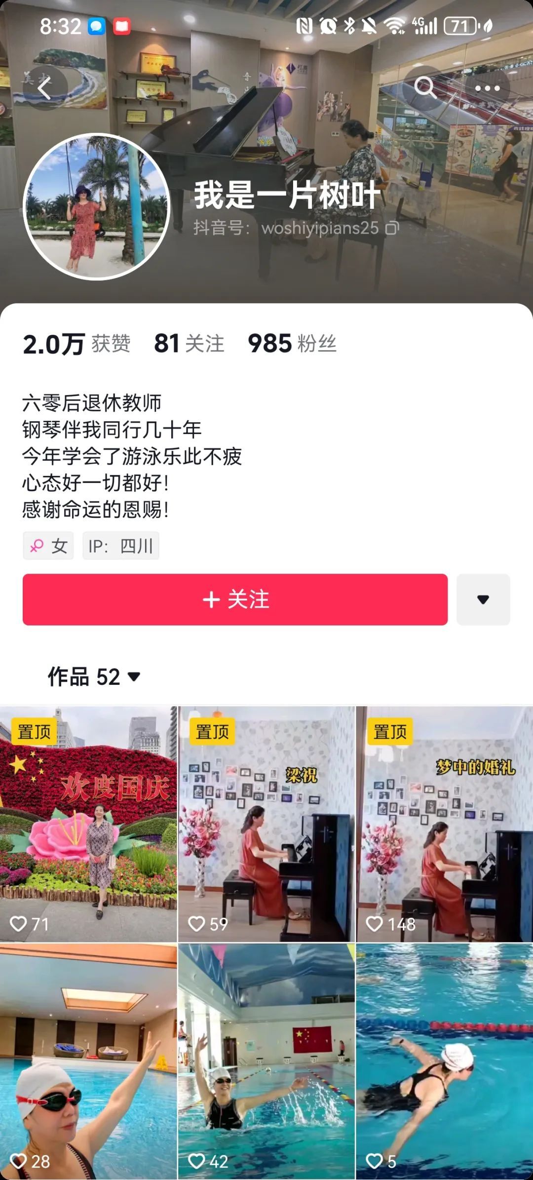 有一位成都的阿姨,是退休教师,来我的评论区里汇报,“我六十多岁,网上看视频学习游泳,三个月蝶仰蛙自全部会游了”。很多网友给她点赞。她把这件事写进自己的抖音简介,得意洋洋,说“今年学会了游泳,乐此不疲!”