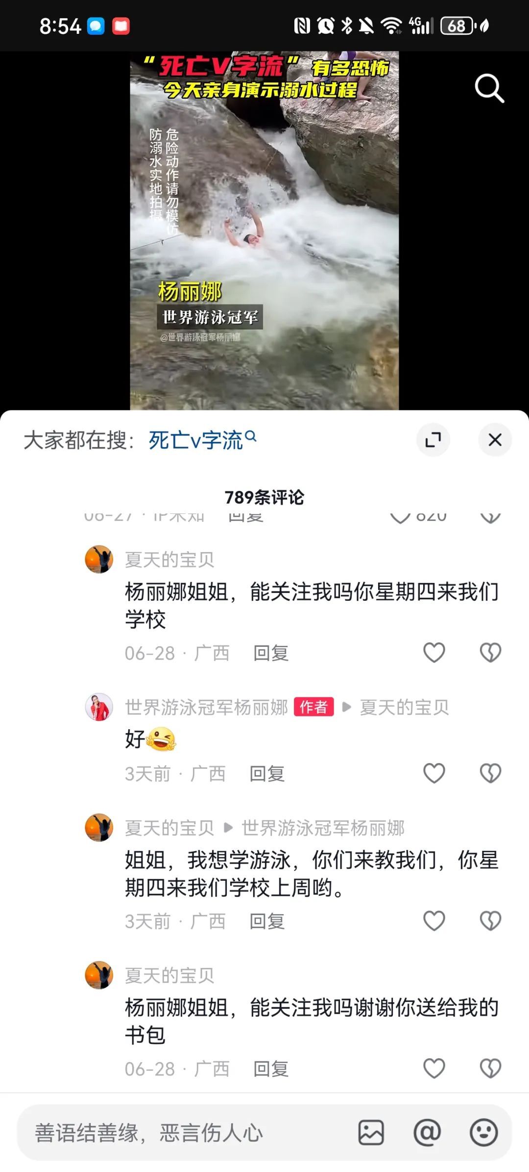 因为做防溺水教育,我的抖音关注列表里,出现了几位类似的小朋友。在乡村学校,讲完了防溺水知识,我还会分享自己的故事。我告诉他们,我和他们一样,7岁就离开父母,住校训练,为了竞技的梦想努力。孩子们也和我分享自己的梦想,说想当警察,医生,和老师。