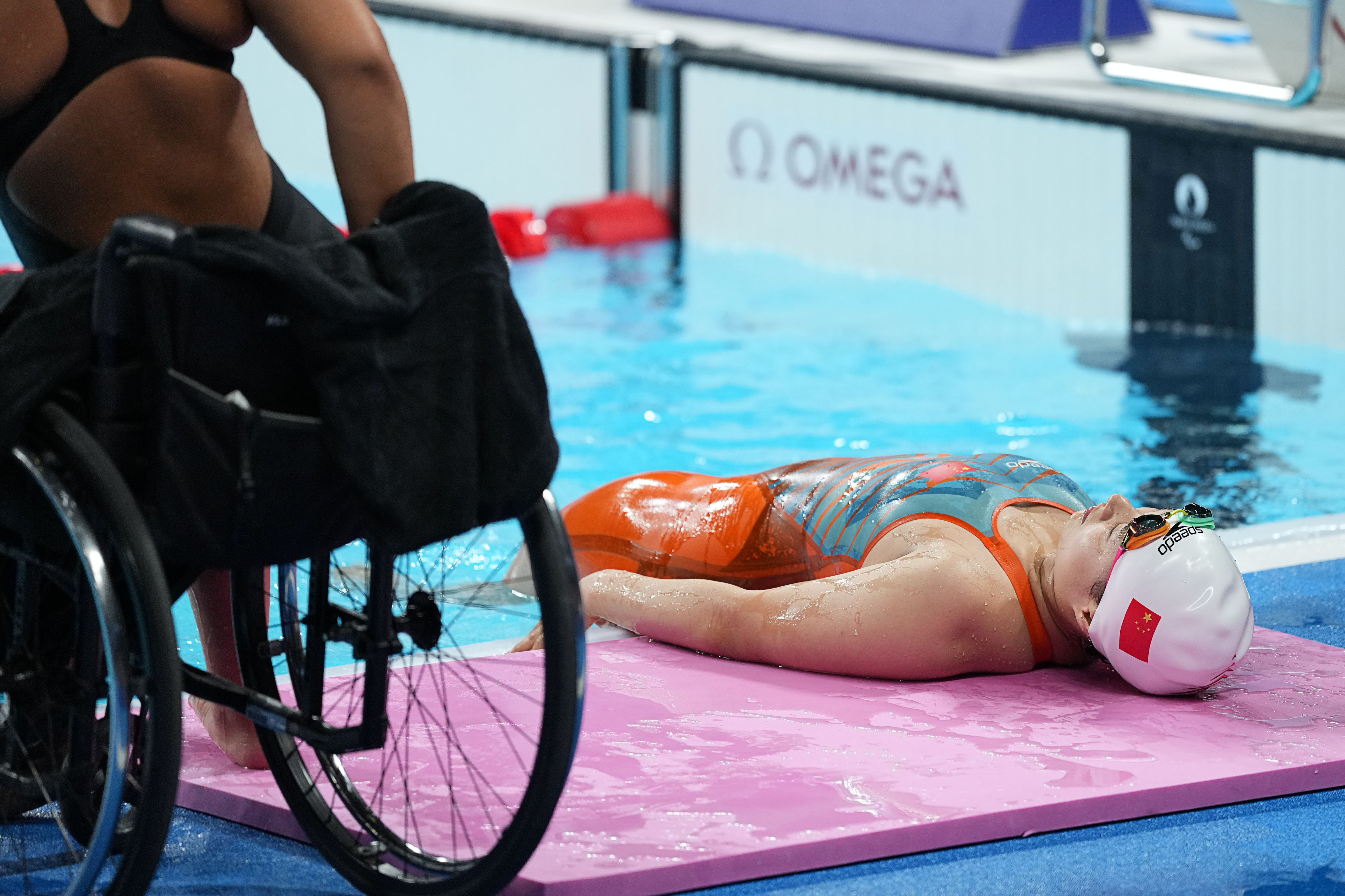 9月6日,蒋裕燕在比赛结束后躺在泳池边休息。新华社记者 熊琦 摄