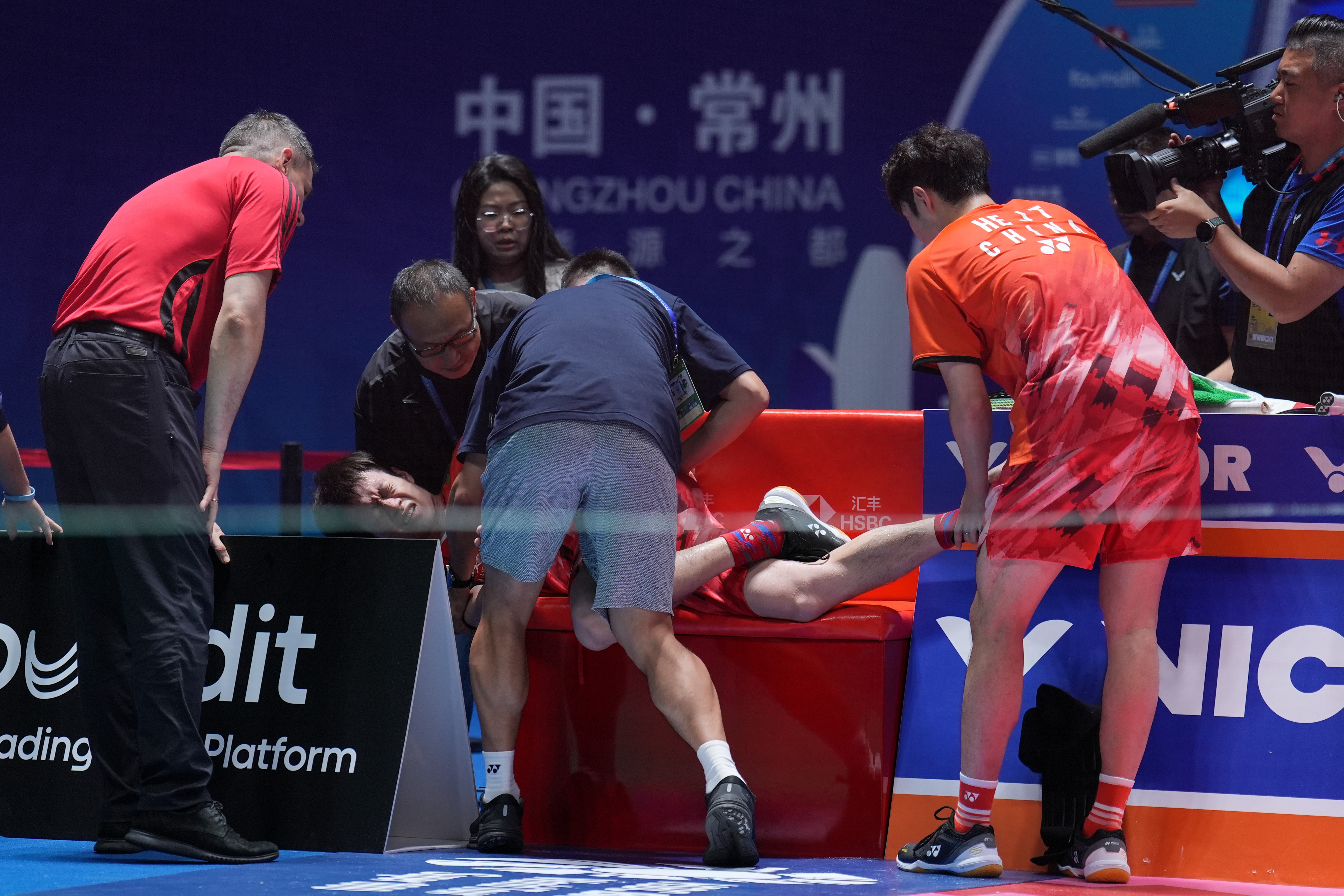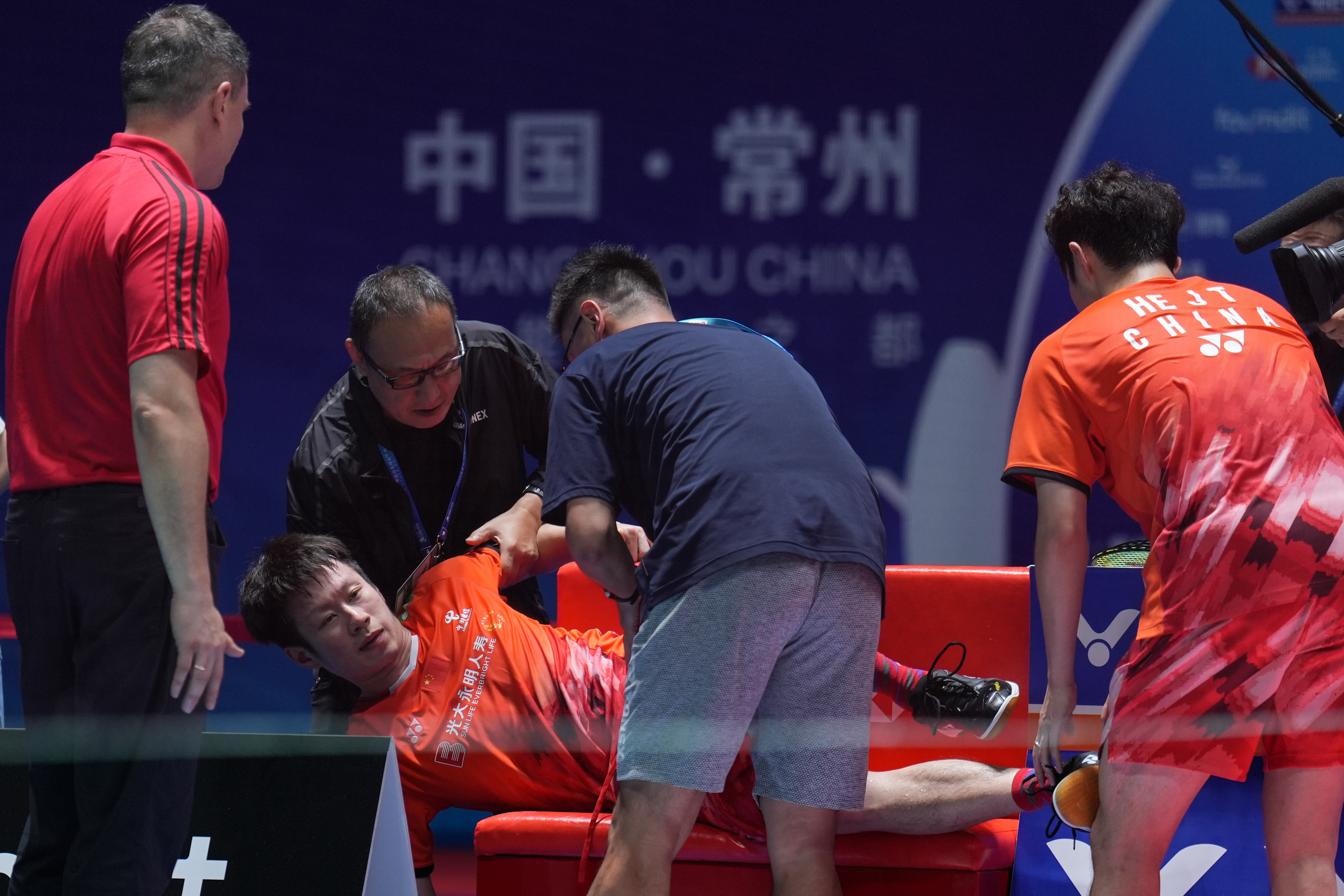 9月22日,任翔宇在比赛中受伤接受治疗。新华社记者 李博 摄