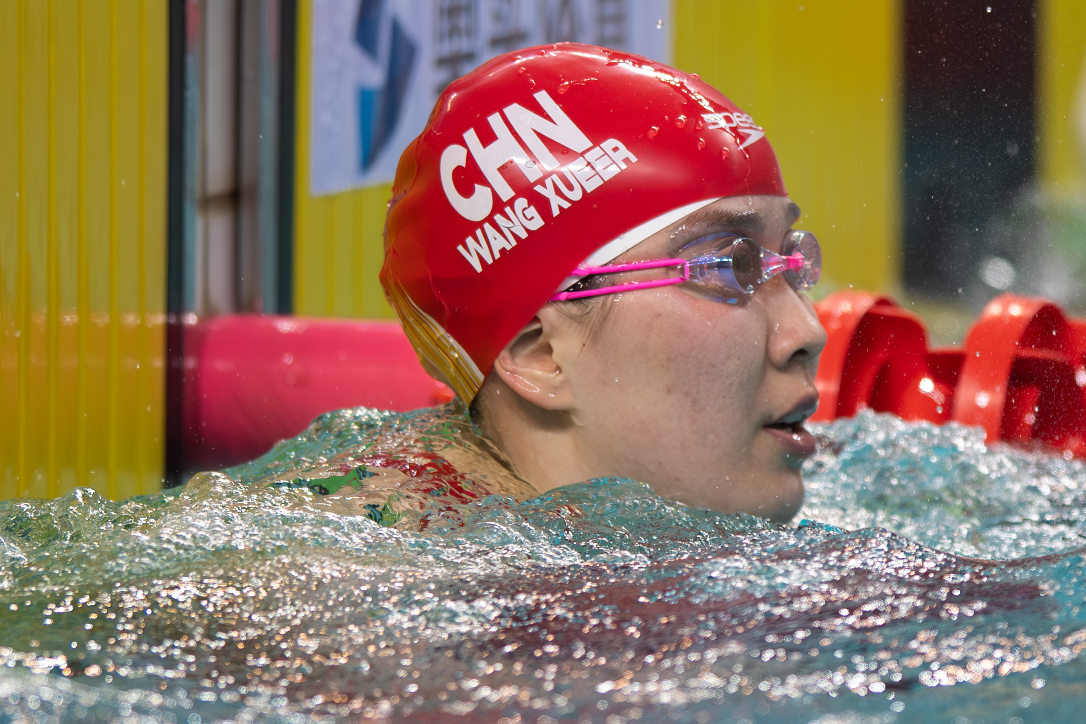 9月26日,广东队选手汪雪儿在比赛后查看成绩。她以27秒30的成绩晋级决赛。新华社记者 杜子璇 摄