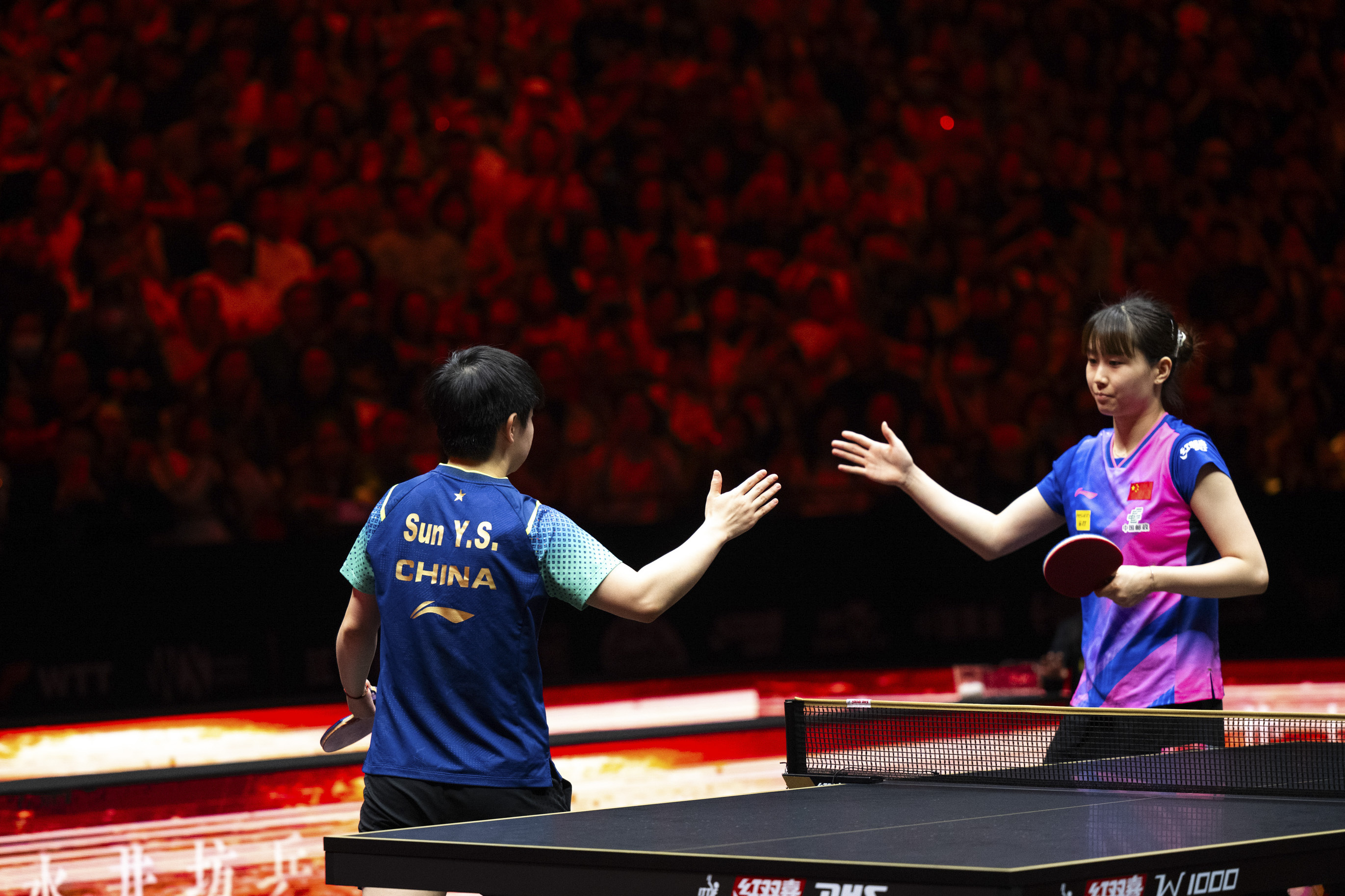 10月3日,孙颖莎(左)在比赛结束与队友刘炜珊致意。新华社记者 肖艺九 摄