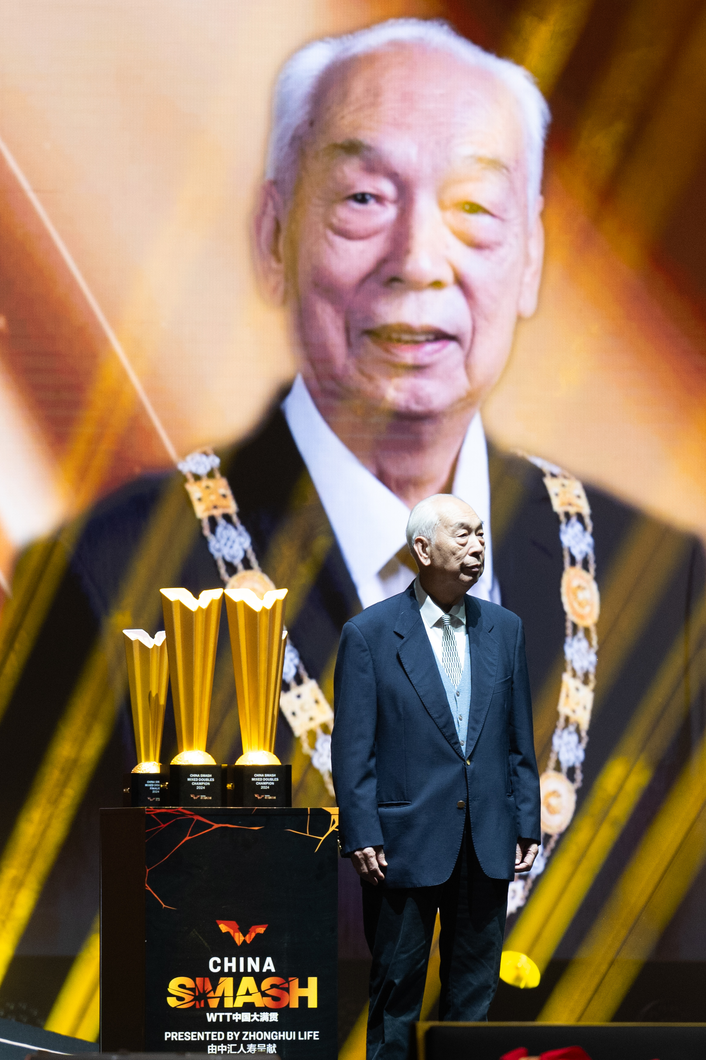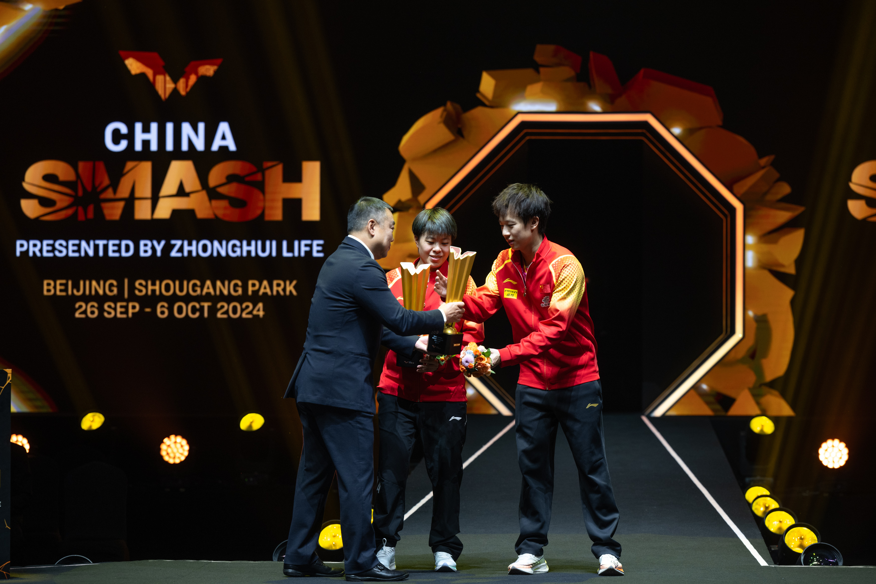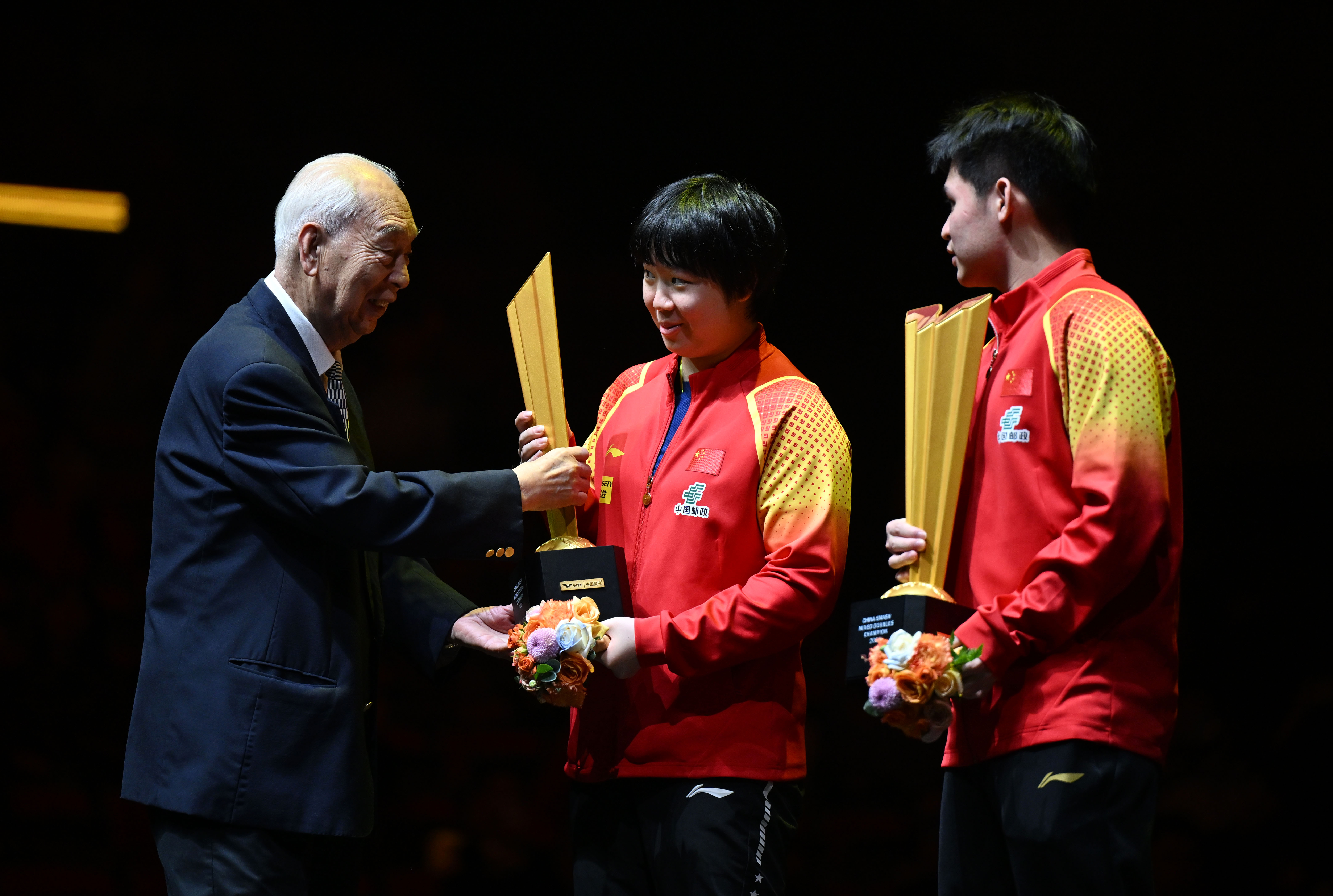 10月4日,“体育工作杰出贡献者”国家荣誉称号获得者张燮林(左)为冠军林诗栋(右)/蒯曼颁奖。新华社记者 陶希夷 摄