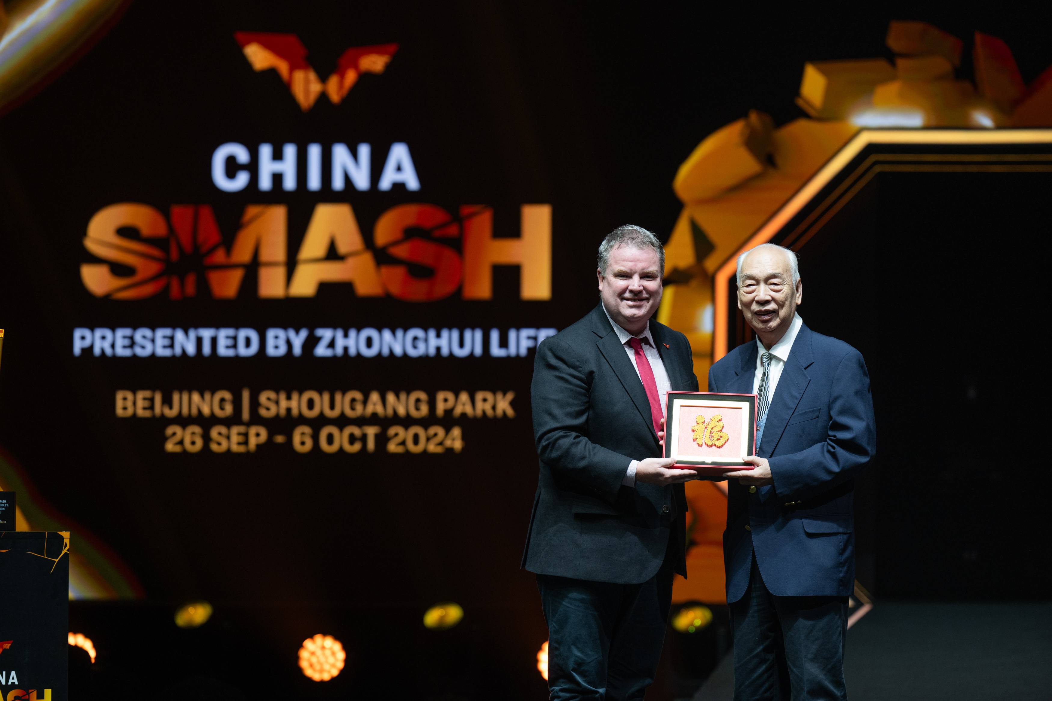 10月4日,国际乒联集团首席执行官、世界乒乓球职业大联盟(WTT)董事史蒂夫·丹顿向“体育工作杰出贡献者”国家荣誉称号获得者张燮林(右)赠送纪念品。新华社记者 肖艺九 摄