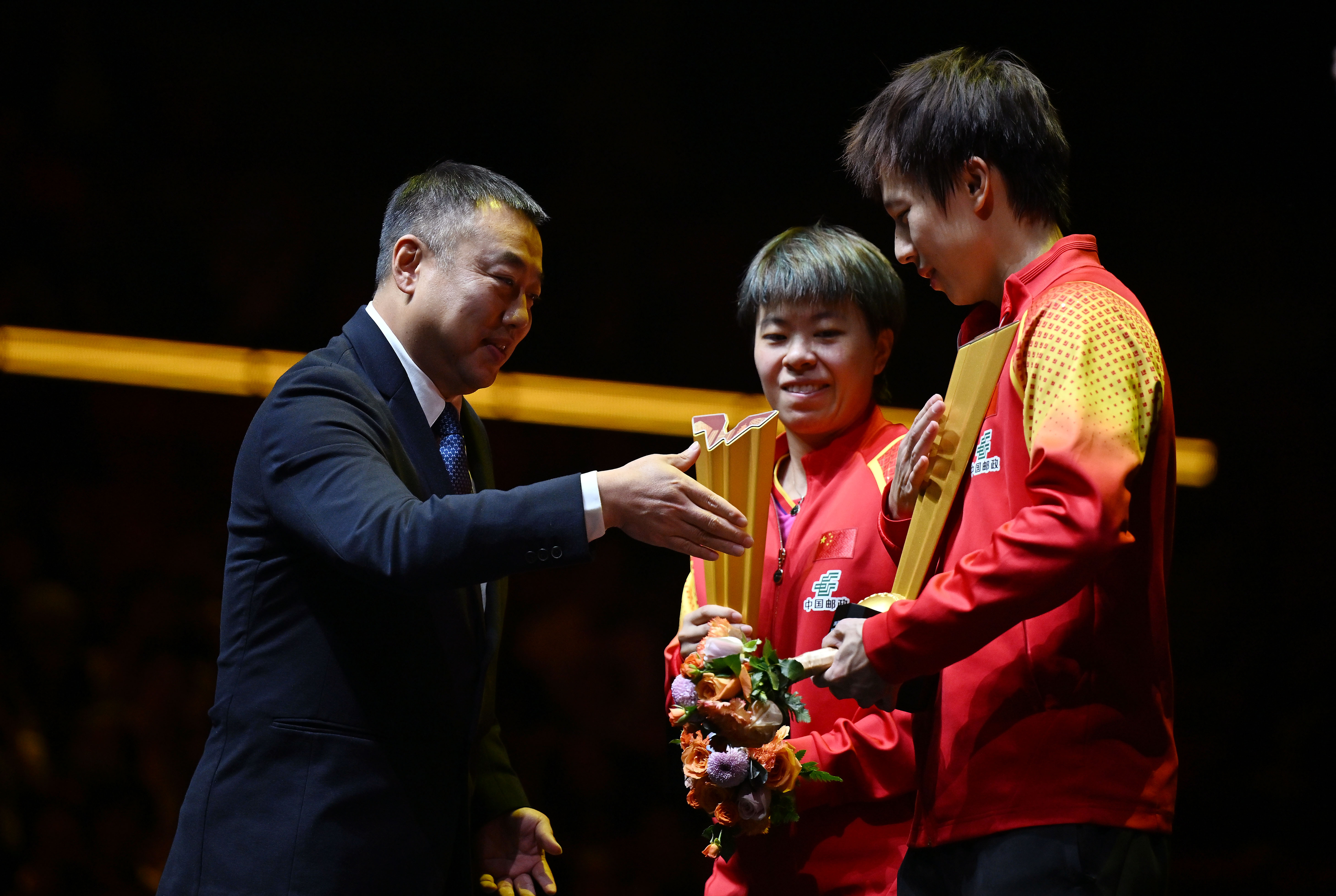 10月4日,中国乒协主席刘国梁为亚军林高远(右)/王艺迪颁奖。新华社记者 陶希夷 摄