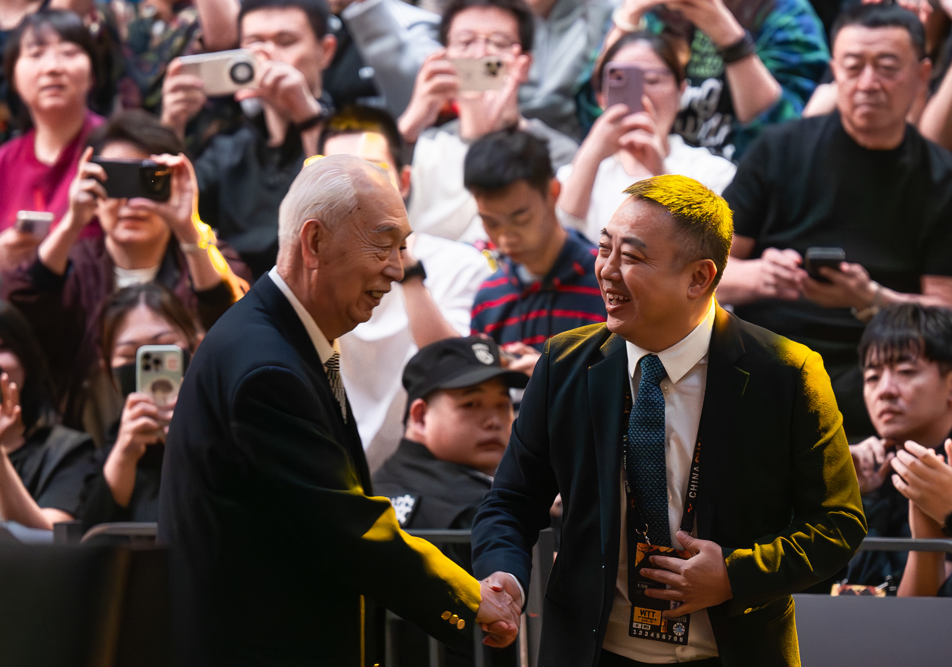 10月4日,中国乒协主席刘国梁在比赛间隙与“体育工作杰出贡献者”国家荣誉称号获得者张燮林(左)握手致意。新华社记者 肖艺九 摄
