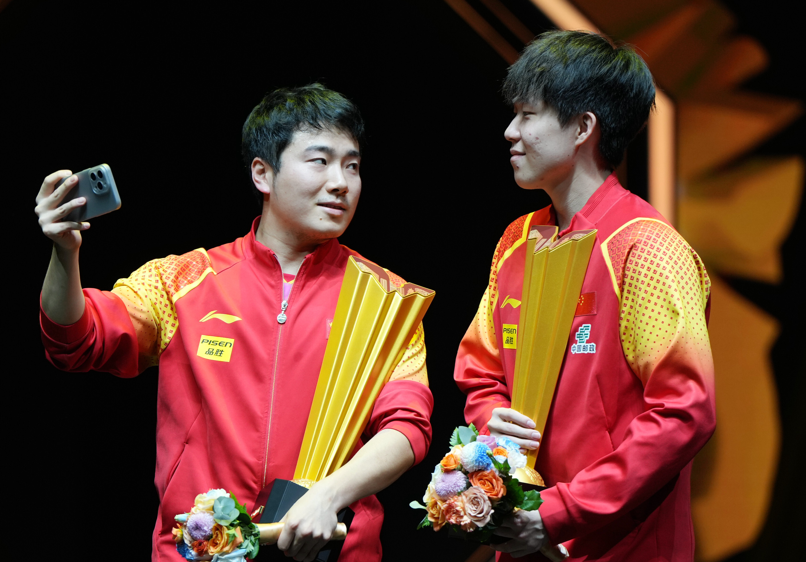 10月5日,王楚钦(右)/梁靖崑在颁奖仪式上合影。新华社记者 张晨霖 摄