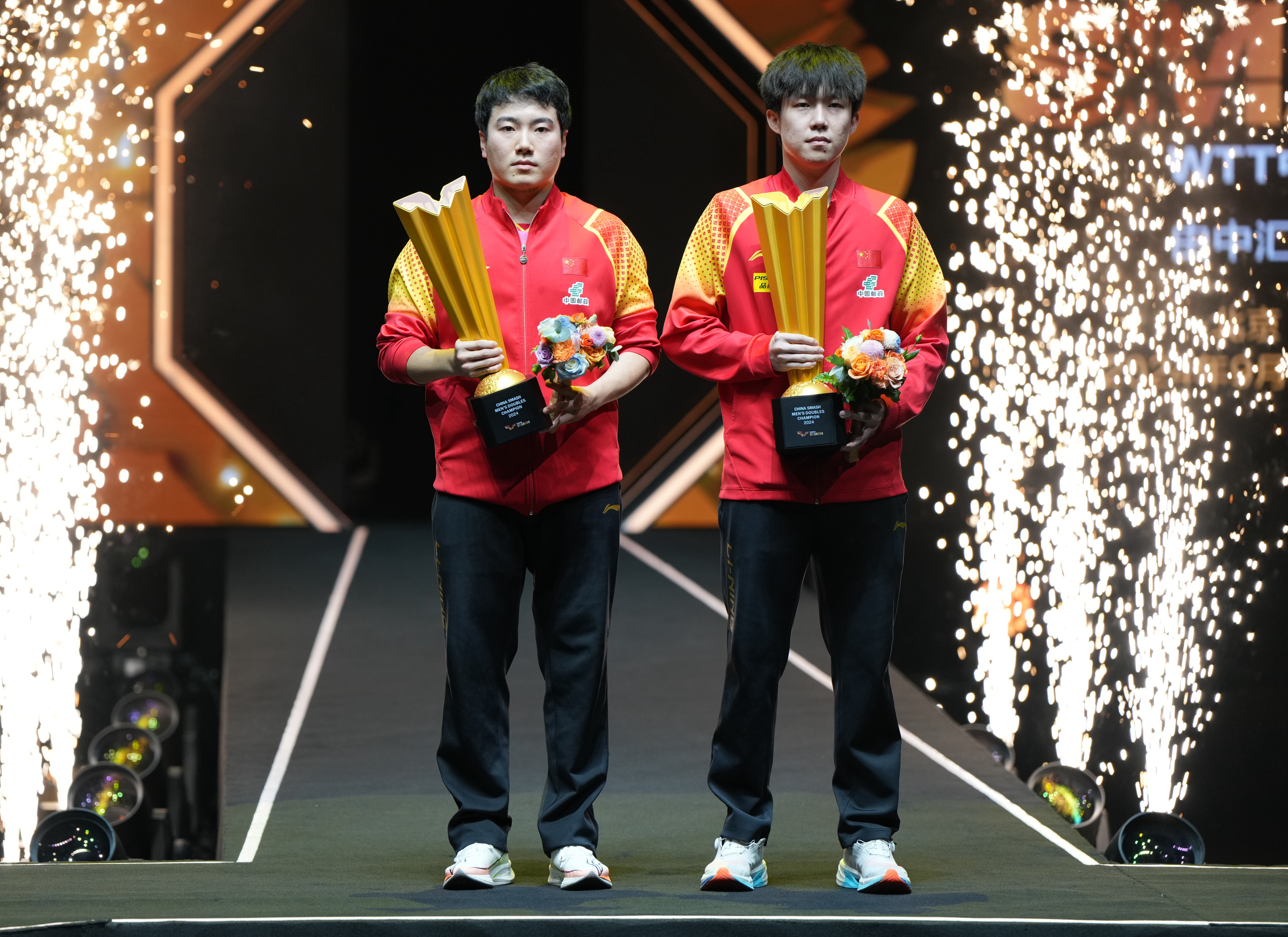 10月5日,冠军王楚钦/林诗栋在颁奖仪式上。新华社记者 肖艺九 摄