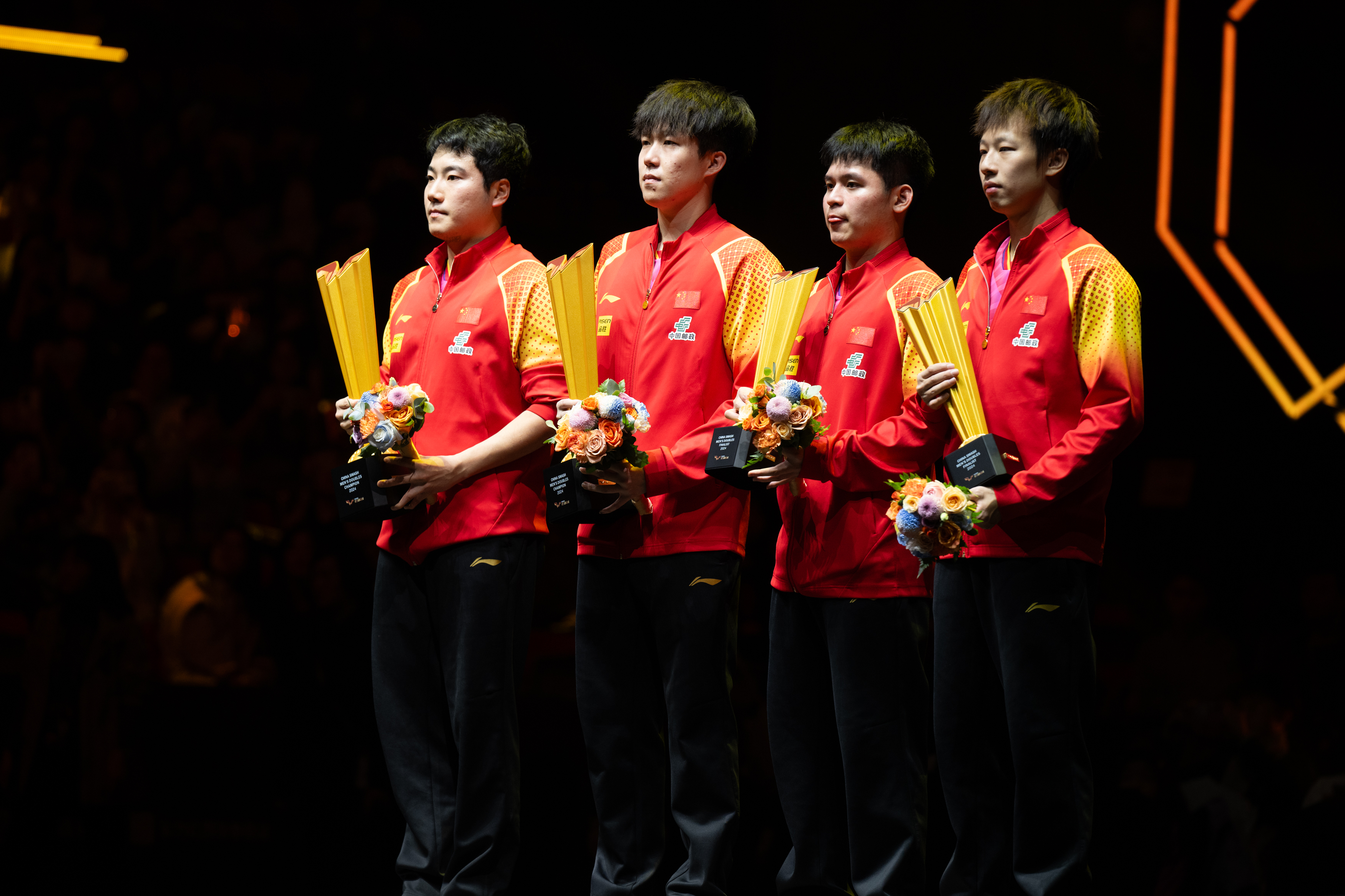 10月5日,冠军王楚钦(左二)/梁靖崑(左一)和亚军林高远(右一)/林诗栋在颁奖仪式上。新华社记者 张晨霖 摄