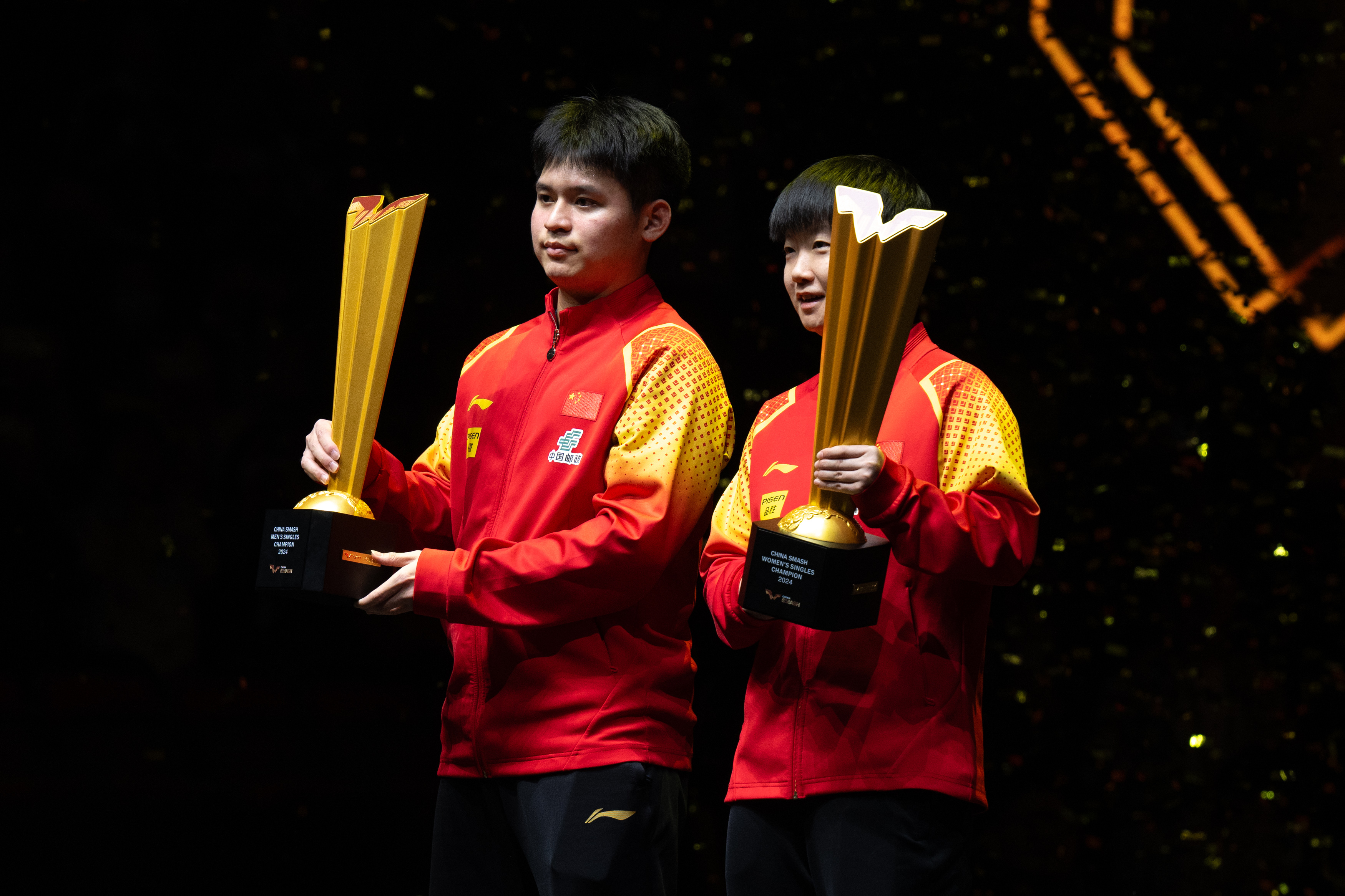 10月6日,男单冠军林诗栋(左)与女单冠军孙颖莎在颁奖仪式上合影。新华社记者 肖艺九 摄