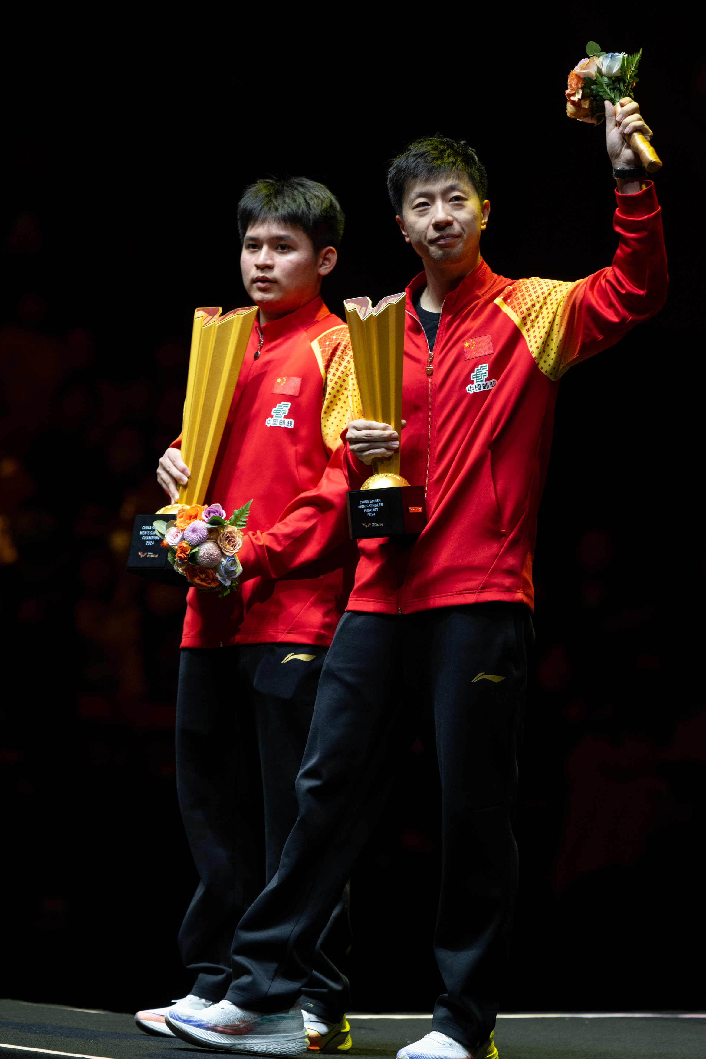 10月6日,冠军林诗栋(左)、亚军马龙在颁奖仪式上。新华社记者 肖艺九 摄