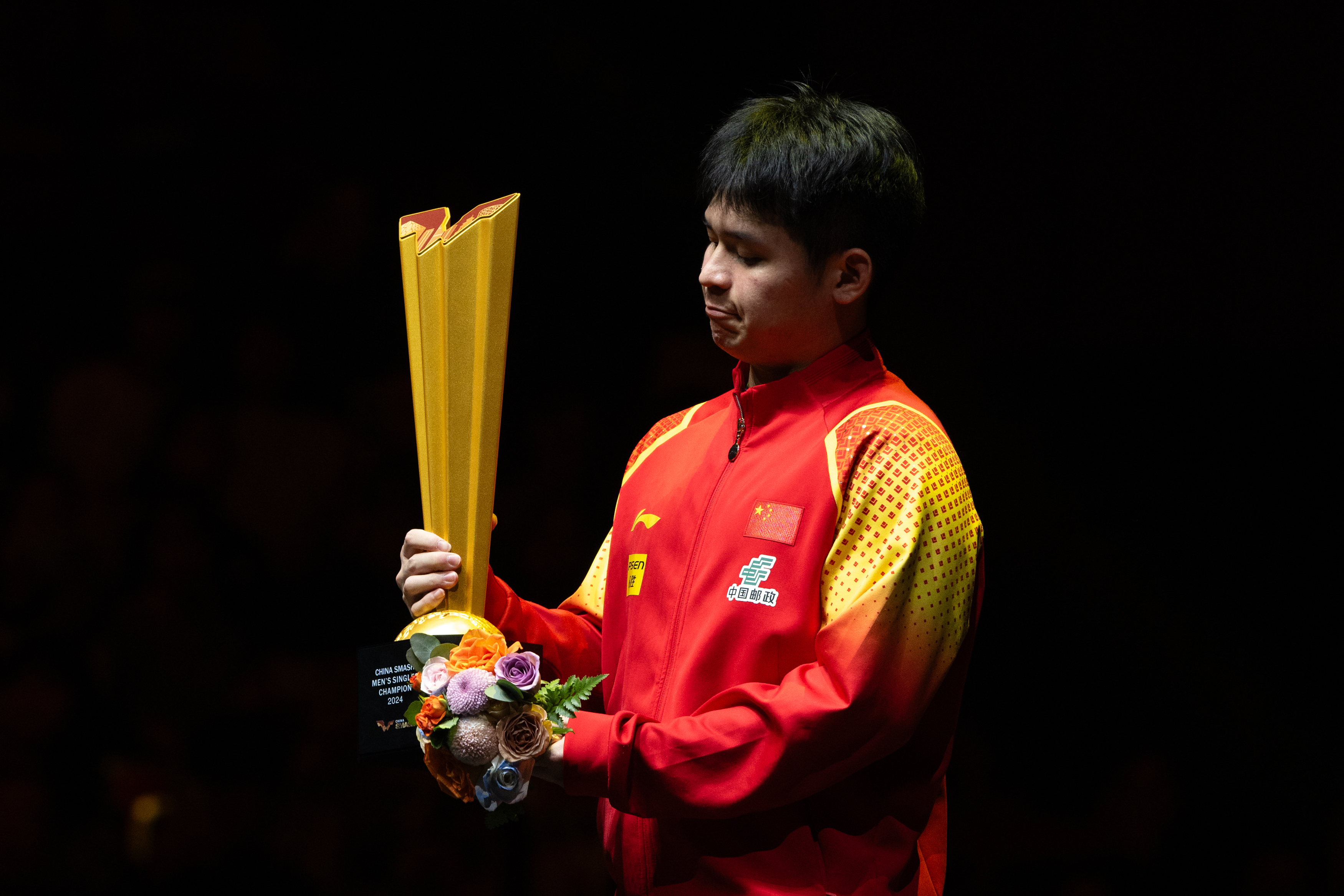 10月6日,冠军林诗栋在颁奖仪式上端详奖杯。 新华社记者 肖艺九 摄