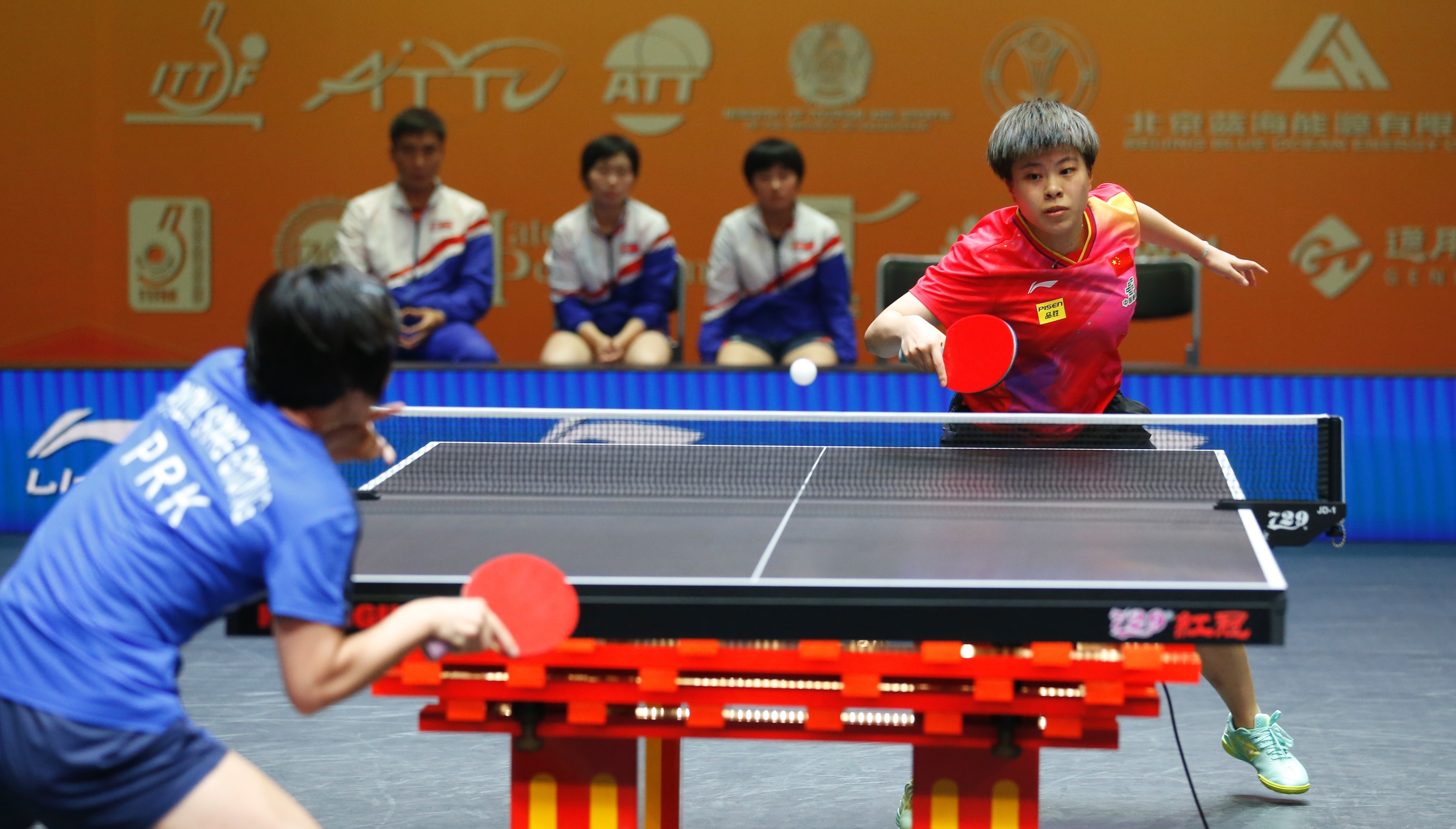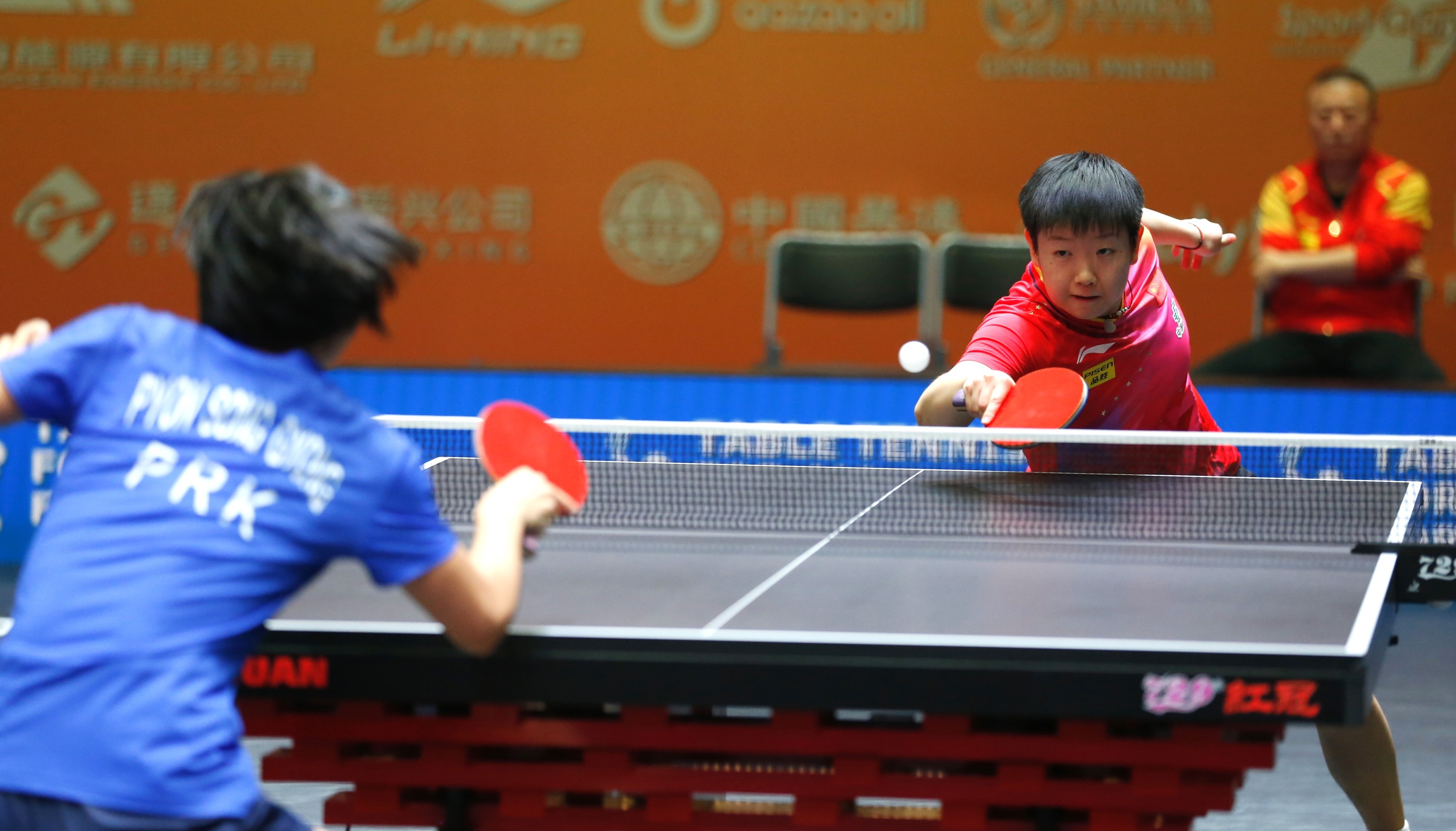 10月8日,中国队选手孙颖莎(左)在比赛中回球。最终,她3比2战胜朝鲜队选手边松景。新华社发(奥斯帕诺夫摄)